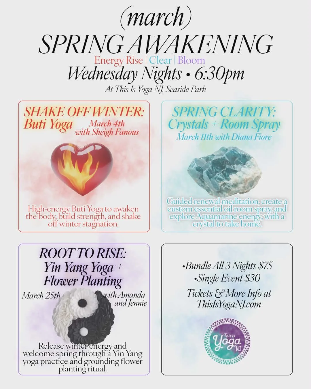 Each week offers a unique experience designed to energize, inspire, and refresh: shake off stagnant energy with Buti Yoga, invite clarity and renewal through crystal meditation and custom spring room sprays, and embrace balance with Yin Yang Yoga and flower planting. This series is a holistic way to celebrate the changing season, reconnect with your vitality, and move into spring feeling lighter, grounded, and alive.