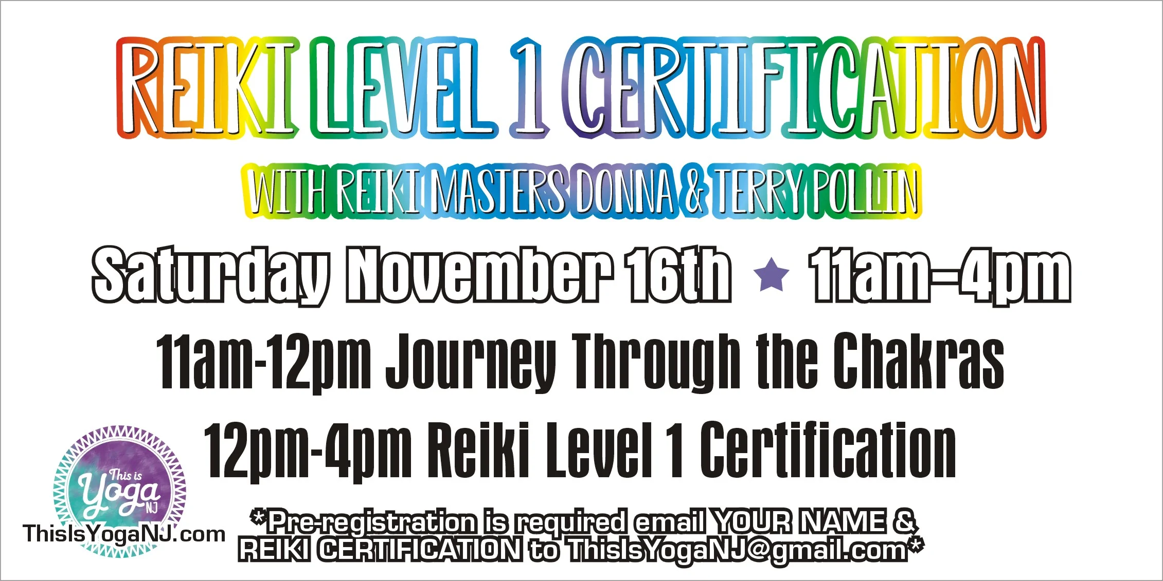 email YOUR NAME & REIKI CERTIFICATION to ThisIsYogaNJ@gmail.com