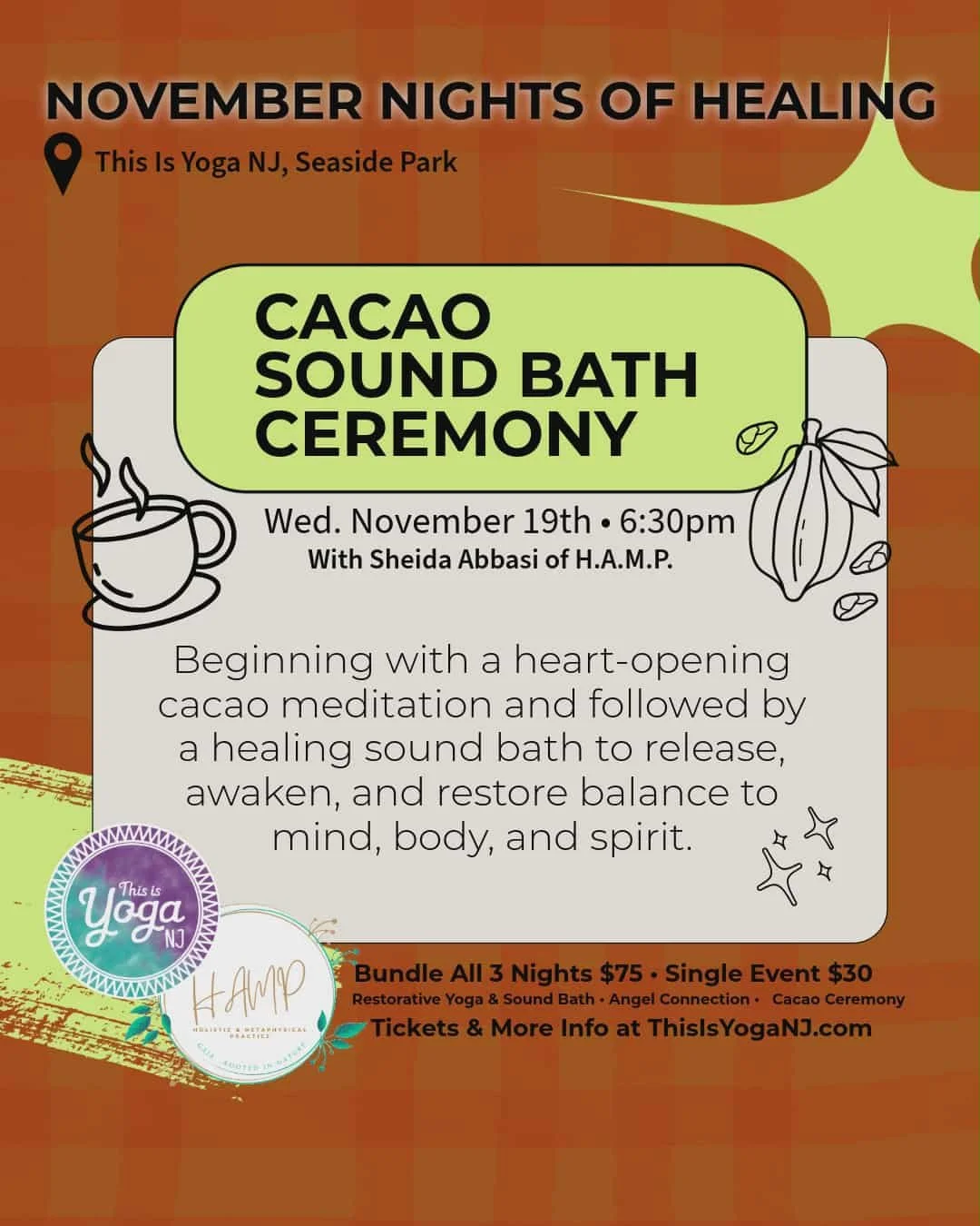 Join us in collaboration with Sheida Abbasi for a heart-opening evening of connection, healing, and relaxation. We’ll begin with a short meditation to ground our energy and welcome the sacred cacao medicine into our gathering. You’ll learn about cacao’s powerful healing properties before enjoying a warm cup of organic ceremonial cacao blended with plant-based milk and special herbs designed to support third-eye activation, heart opening, and emotional release.