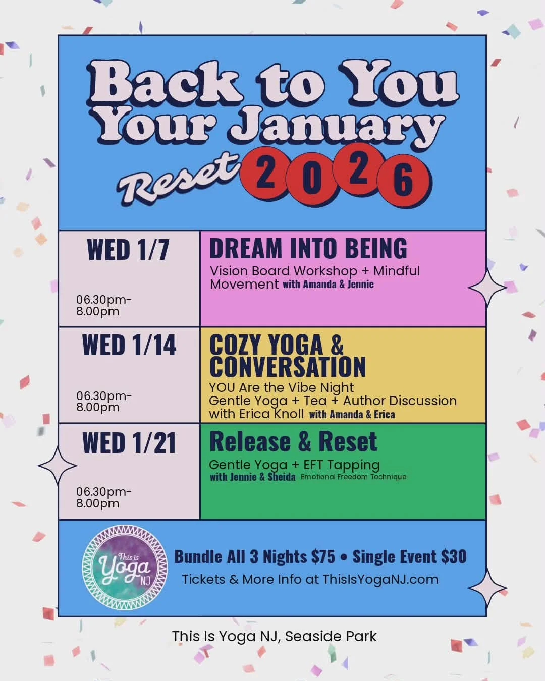Our Back to You: Your January Reset series invites you to ease into the new year with three soul-nourishing Wednesday evenings of gentle yoga, creativity, emotional wellness, and heartfelt community. Each event is designed to bring you back home to yourself after the holiday season; refilling your cup, resetting your energy, and reconnecting you with what matters most.
