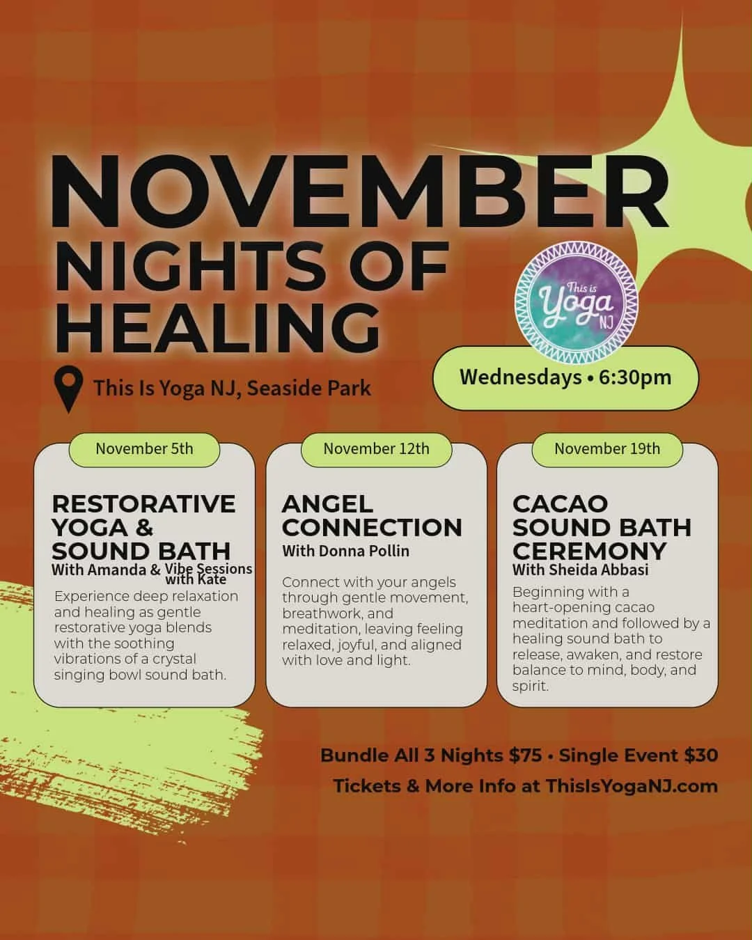 Join us for three special Wednesday evenings in November at This Is Yoga NJ in Seaside Park. As the season shifts and the days grow shorter, this series of classes is designed to bring warmth, balance, and renewal before the holidays. Each night offers a unique healing experience—through yoga, sound, or ritual—that invites you to slow down, release stress, and reconnect with your inner peace.